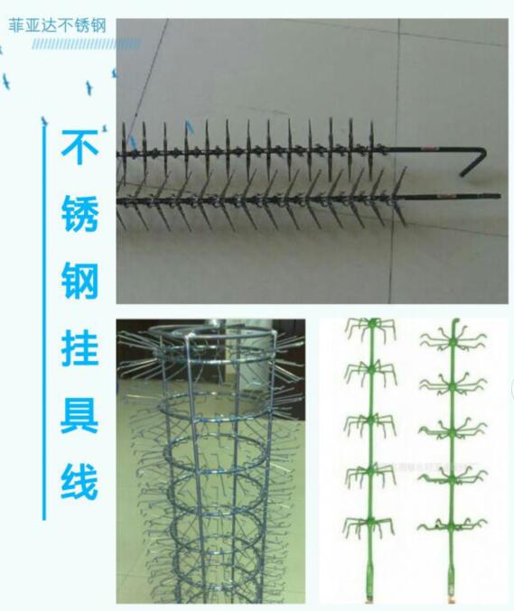 不銹鋼掛具也是不銹鋼線材生產而成的,主要選用304H材質的不銹鋼霧面線(又稱不銹鋼掛具線)。此種線材含有8個鎳和18個鉻,屬于不銹鋼線中較硬的材質,表面選用樹脂面,也稱灰面,線材表面會有一些灰色粉末,它強度高,耐酸堿,穩定性很好。